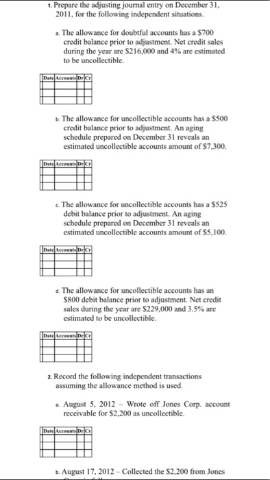 Notice that the estimated uncollectible accounts on december 31, 2015 are $4,800 but allowance for doubtful accounts has been credited with only $1,500. the reason is that there is already a credit balance of $3,300 ($4,500 $1,200) in the allowance for doubtful accounts. If the allowance account has a $5,000 credit balance before adjustment, the adjustment would be for $19,400 calculated as $24,400 estimated amount uncollectible from exhibit 1 5,000 existing credit balance in the allowance account. the entry would be:.